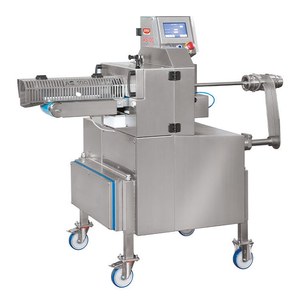 These products can be tied in continuous mode, separated by a single tie, or separated by double binding, to get a better dry during seasoning or to have more space between products to cut. The AS 100 TI can make loops to hang products and has also the integrated automatic cutting system. Thanks to the automatic output belt with variable speed this model is completely automatic and has been projected to work with every continuous vacuum filler through an impulses cable. This model is suitable to tie products by portion. The AS 100 TI is totally built in stainless steel, versatile, easy to clean and safe, practical to use. Our tying system and patented filling system permits to brake carefully the casing through the special pneumatic brake with constant adjustment during all the production phases.
