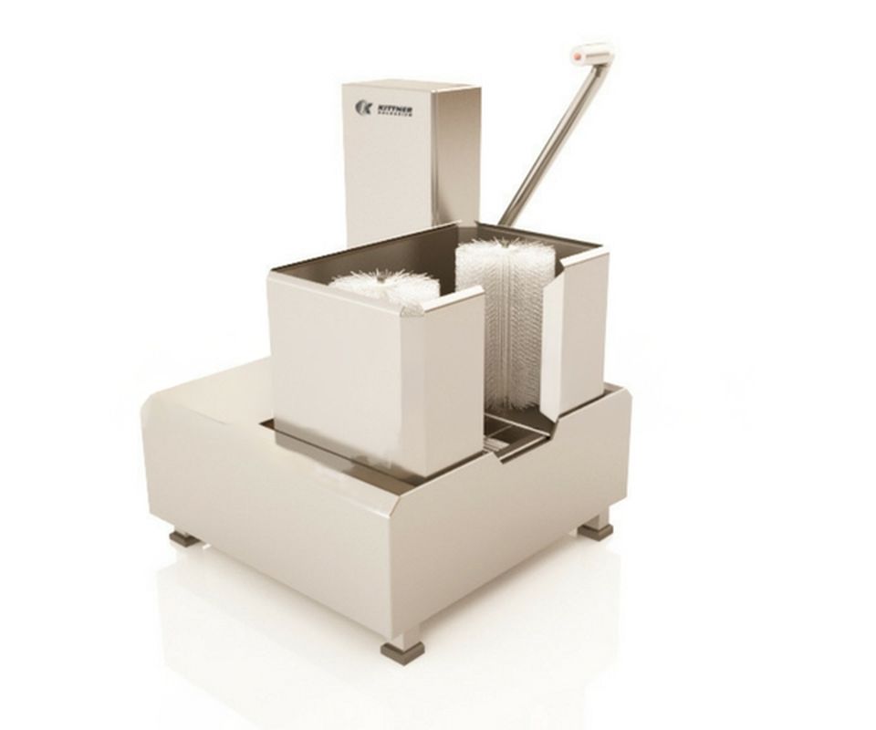 With two rotating brushes for the bootleg and another rotating brush for the sole. The button integrated in the handle and the dosing pump control the mixture of water and cleaning agent sprayed onto the boot. The amount of cleaning agent can be adjusted by using different sizes of suck-in valves. The machine corpus is made entirely out of stainless steel, material No. 1.4301. The machine complies with the high CE-Requirements and EU-and USDA regulations.