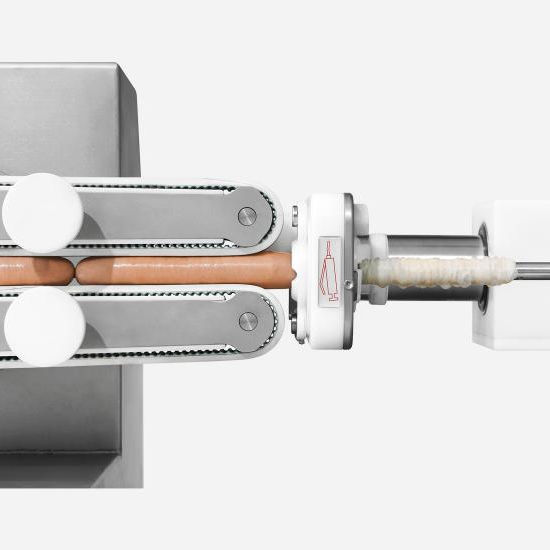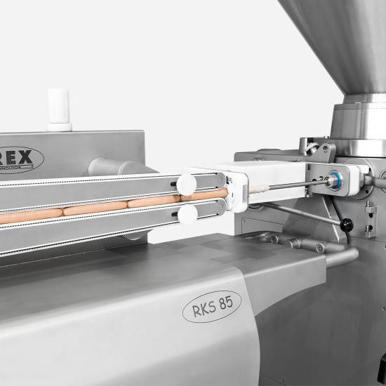 Calibration performs an important function in achieving the specified length and exact weight of the product. The RKS ensures an easy changeover from natural to artificial casing and vice versa, and is the basis for further process optimization. The product (sausages, frankfurters) is fed directly from the syringe casing holder onto the two conveyors of the RKS. This way, the twisting process is optimized as much as possible and product rejects due to casing breakage are reduced. The RKS conveyors are height-adjustable and can be adjusted to fit products of any diameter, ensuring a uniform weight and length output, which improves product quality and ensures compliance with the standard.nThe RKS calibration device is equipped with a servo drive that can be set and monitored on the touchscreen of the syringe control unit. The speed of the conveyors is automatically adjusted to the specific product and portion size, thus ensuring minimum changeover time.nThe product calibrated on the RKS can be fed directly to the RHS sausage hanging line under control, from which the product is removed by smoking sticks.