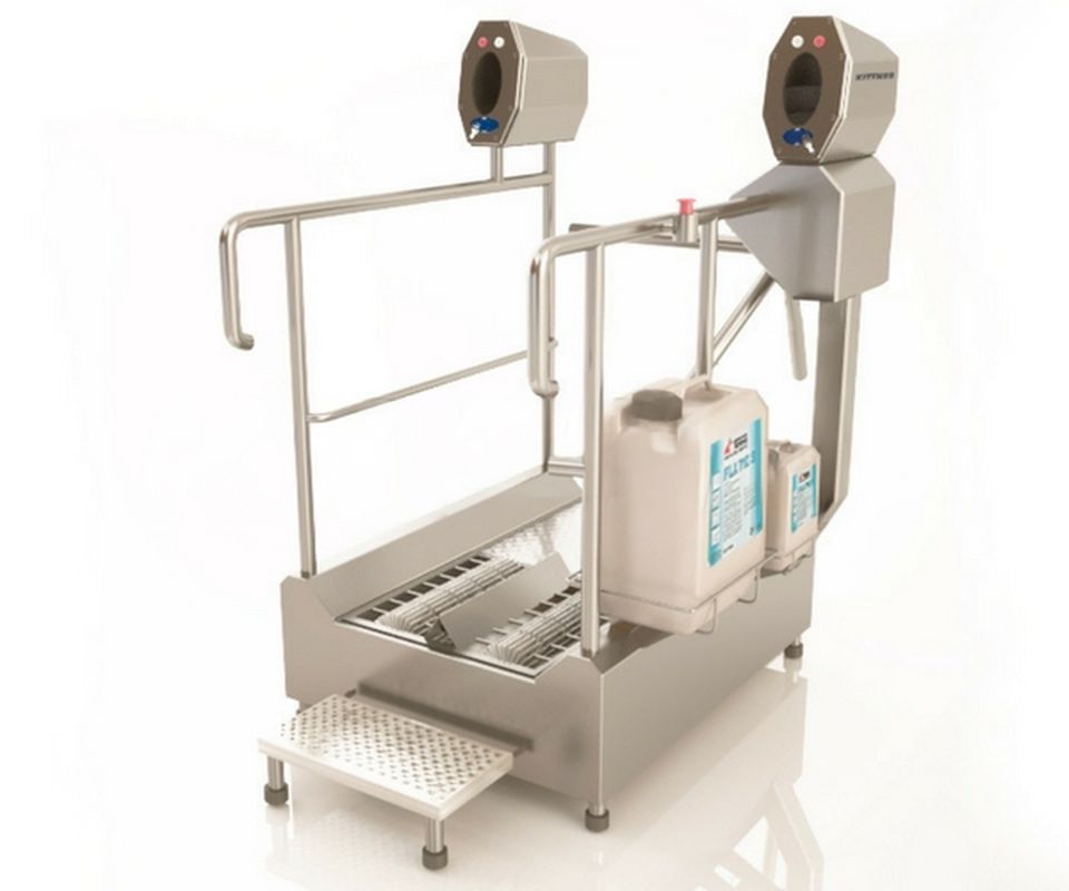 Designed for hand disinfection with continuous cleaning of the soles of clogs or boots when passing through the machine. Hands are disinfected without turning the body side-wards. This machine is accessible from both sides. Standard execution with four nozzles and solenoid valve for minimal consumption of disinfectant. Machine corpus made entirely out of stainless steel, material No. 1.4301. The machine complies with the high CE Requirements and EU- and USDA regulations.