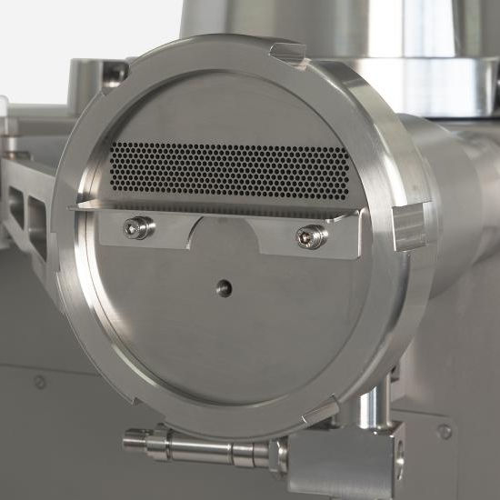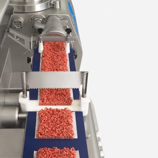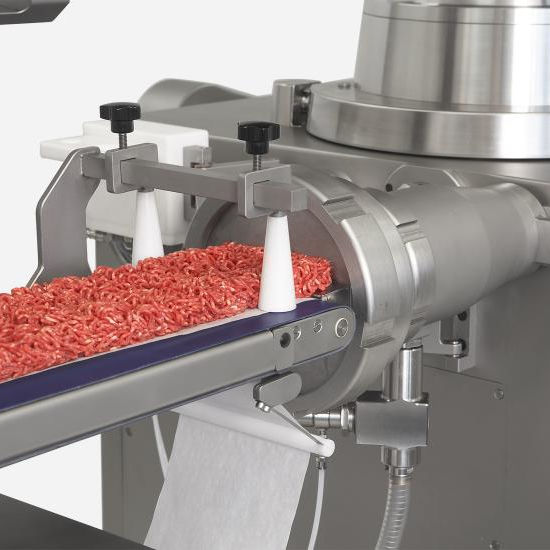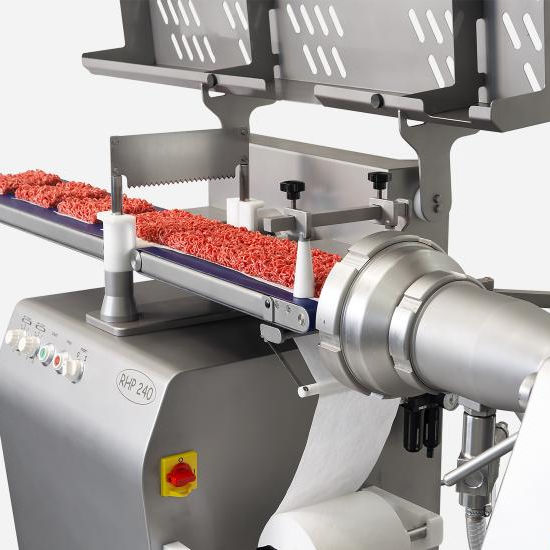 The end piece of the MC 3-3 can be individually equipped to suit the size and shape of the product. Product widths with different grain sizes are possible – from 60 to 220 mm. The design of the end part in the form of special grids allows you to produce portioned products of a given shape, for example, kebabs and croquettes (several pieces in a row) with a lining on paper.In the process of producing portioned minced meat, grinding plays an important role. Pre-ground raw materials are precisely portioned with a syringe, and the combination of the grinder with the MC 3-1 and MC 3-3 attachments brings the grain and portion size to the required parameters. The cutting speed of the whisk drive can be adjusted to create the desired minced meat pattern. The independent servo drive and the functions of the impeller attachment are controlled via the touch screen of the syringe control unit, and depending on the selected portioned product, the cutting speeds can be set to your liking. The RHP 240 portioning device completes the line. The device is connected to the filling syringe and the MC 3-3 wolf nozzle. The RHP 240 transports the mass of minced meat, dividing it into portions exactly according to the selected size.