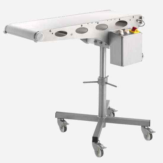 The conveyor is mounted on a movable frame made of high quality stainless steel.