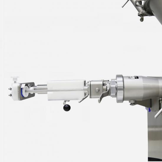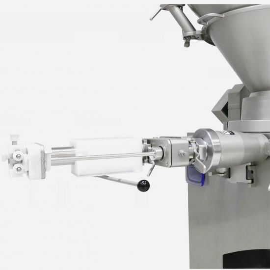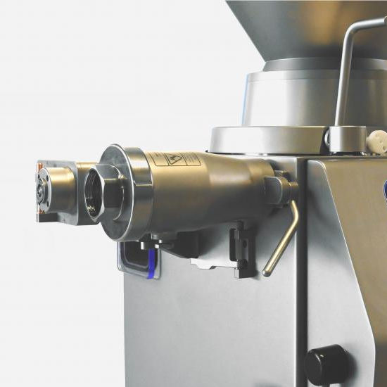 Thanks to the integrated torsion gearbox, the MS 3-2 wolfpack is perfectly synchronized with a rotating or stationary shell holder. The advantage of working with the wolfram attachment becomes apparent after analyzing specific economic results: combining the filling and grinding processes in one working step significantly shortens the technological process, and the end grates make the product grain size uniform as standard. The diameter of the grate is 130 mm, and the cutting tool can be equipped with: 3 or 5 parts. The independent servo drive and the functions of the wolfpack are controlled via the touch screen of the syringe control unit, and depending on the application, you can set the cutting speeds to your liking. As an option, the MS 3-2 can be used in combination with a pneumatic separator to separate veins and bone residue. The opening time is set in the program on the syringe control unit. The MS 3-2 can be combined with other REX attachments.
