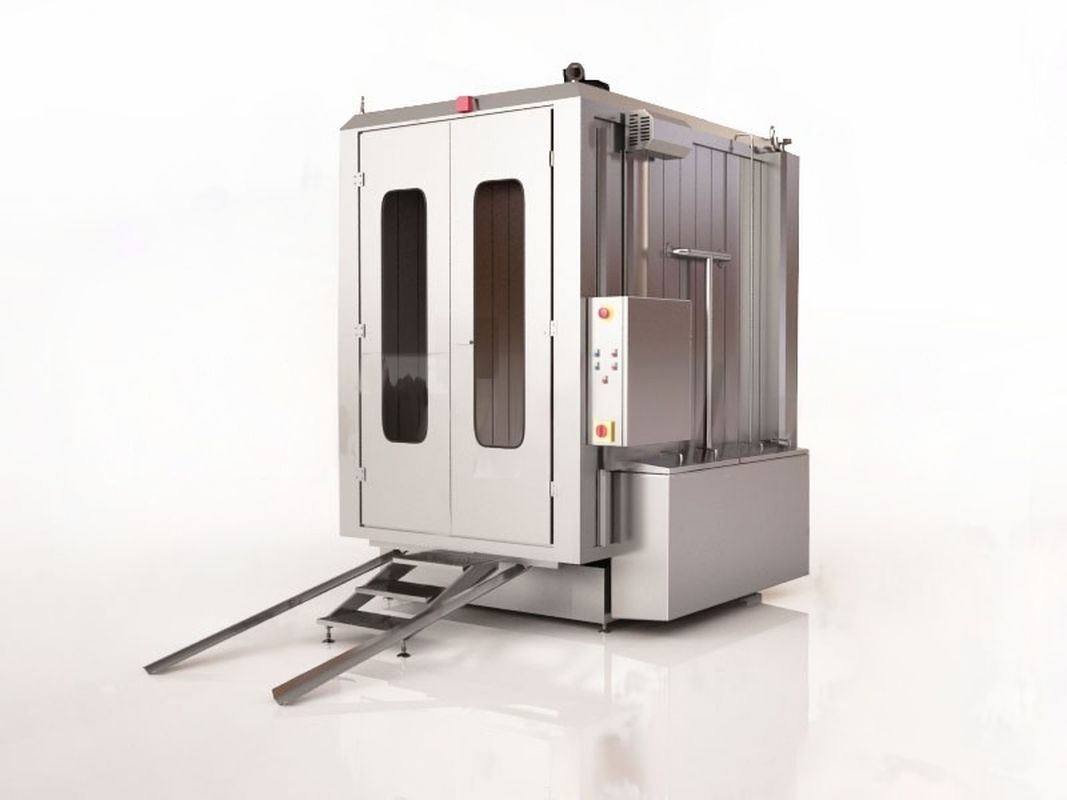 For washing 2 pcs boil or smoke trolleys, each with max dimensions 1015 x 1000 x 2250 mm. The machine is steam heated. Machine corpus made entirely out of