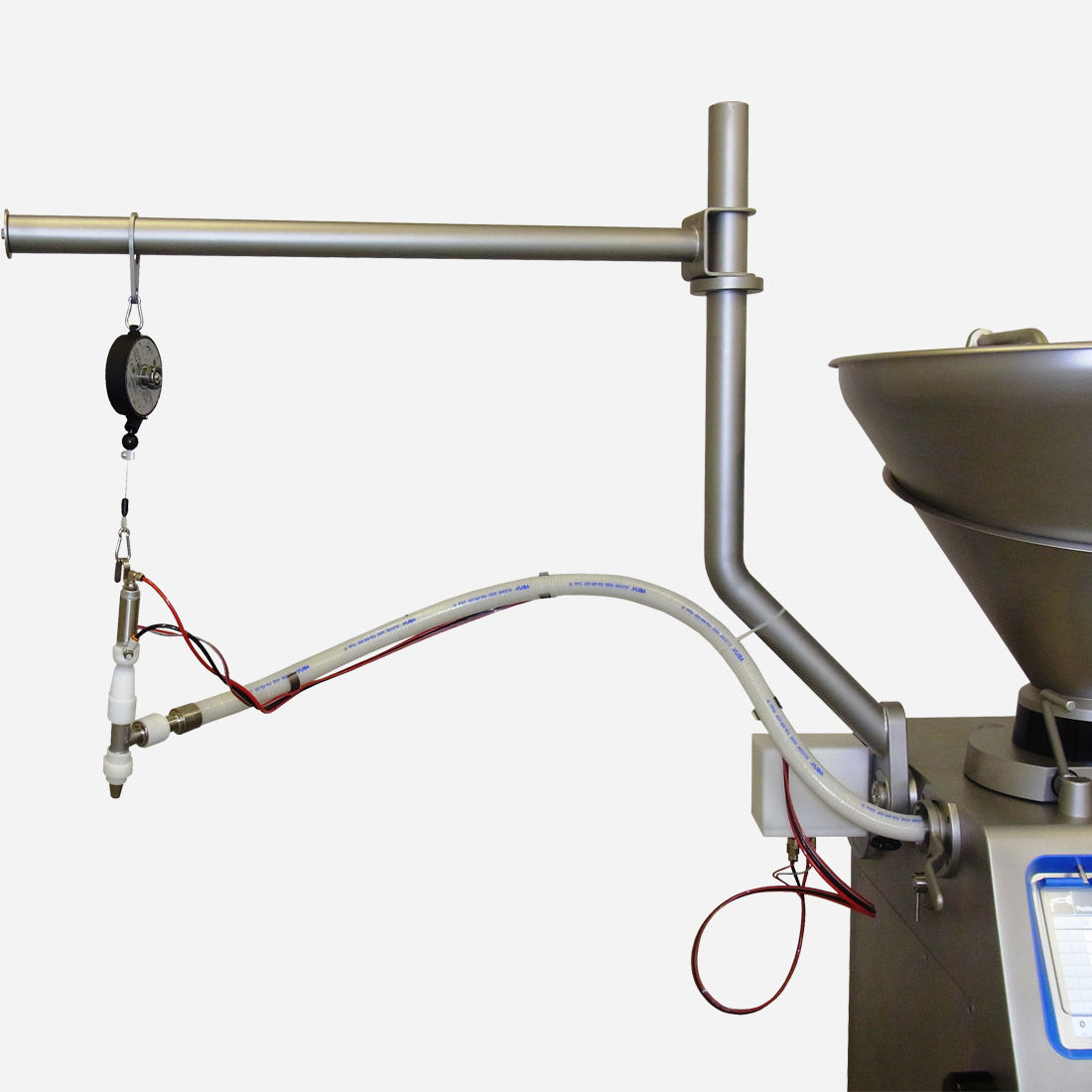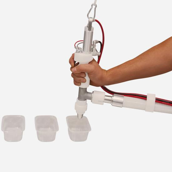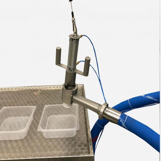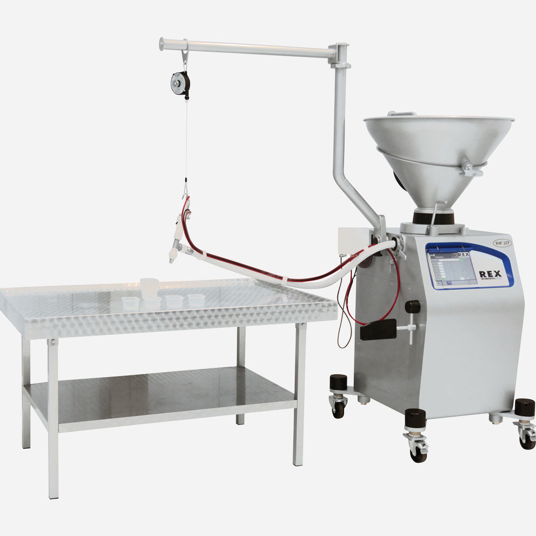 It is used for mobile dispensing of liquid and paste-like masses in various food production facilities, both when filling into retail containers: cups, trays, tin and glass jars, etc., and when portioning layers, dips and other masses on prepared products. The nozzle with a tap that connects to the REX syringe ensures high portioning accuracy, precise dosing and the optimal processing mode for the product.