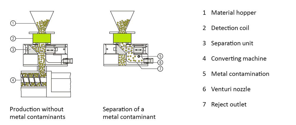 Small metal particles in the melting process of plastics often lead to costly breakdowns of injection molding machines, extruders and blow molders. The amount of such metal contaminants increases during the processing of regranulate and shredded raw materials. As a result, clogging of nozzles, filters and hot runner systems can lead to production downtime and delivery delays. The PROTECTOR metal separator is installed directly above the feeder of an injection molding machine, extruder or blow molding machine. It detects all magnetic and non-magnetic metal contaminants (steel, stainless steel, aluminum, etc.) – even if they are contained in the product. The metal contaminants are ejected through the Quick-Flap separation unit.