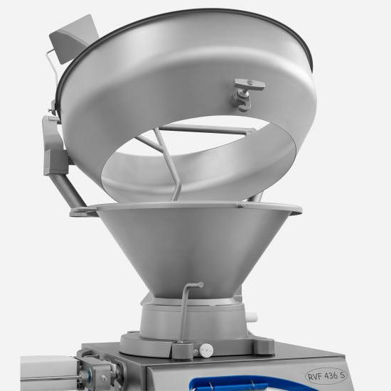 The large-diameter, reinforced slide (rotary-plate) feeding mechanism guarantees exceptional portioning accuracy in continuous operation. No raw material overloading or lubrication is possible: the mass is gently guided during filling, which is especially important for filling structural minced meat and minced meat with large meat inclusions. The rotors are equipped with a choice of 8, 12 or 14 gates, as well as 14 gates, of which 7 are plugs. Equalizing pistons in the rotor additionally support precise portioning.Thanks to the new design of the tipping loading device, the RVF 460 is easy to load and does not lose minced meat.The funnel sizes are available in 100 l, 160 l, 250 l, 350 l. The sensor screen ensures easy maintenance. The REX Servodrive technology completes the innovative automation concept. The twisting of artificial and natural sheaths is facilitated by the fixed or rotating holder. In the “S” version, the syringe is combined with the RKS 85 calibration line and the RHS 230 sausage hanging line.