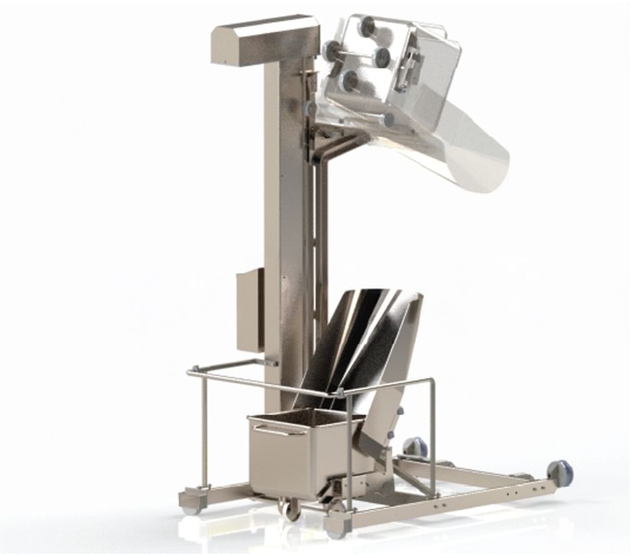 The column lifter on rail with movable tipping chute is designed for unloading 200 & 300L buggies (Tote Bin) DIN 9797. It is easy to operate and maintain. The lifter serves to load several tumblers in a line. The movable tipping chute also allows unloading of liquid products. Chain drive. Gear motor equipped with an electric brake. Up and down movement follows a safety switching scheme (hold to run). Mechanical safety brake prevents the fork from falling in case of chain breakage. Detectable cable ties. Food-approved lubricants. Hygienic design. Available in different executions depending on the position and height of the tumblers.