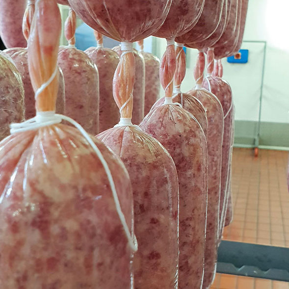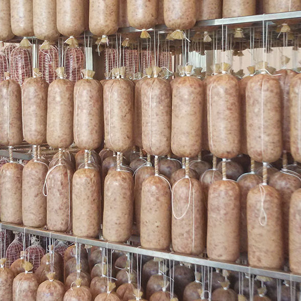 with caliber from 25 to 85 mm, loaded on the filling pipe, in single piece or loose, with semi-curved or straight form. These products can be tied in continuous, separated with a tiying, or separated with double tiying mode, to have a better drying during seasoning or to have more space between them to cut