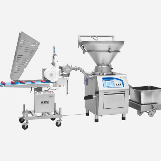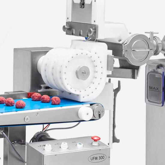 The molded product is fed onto a conveyor belt. Depending on the size of the product, the device can be equipped with rollers of different diameters. The device is perfectly suited for the production of perfectly rounded semi-finished products from minced meat, dough, potatoes and other raw materials.n
