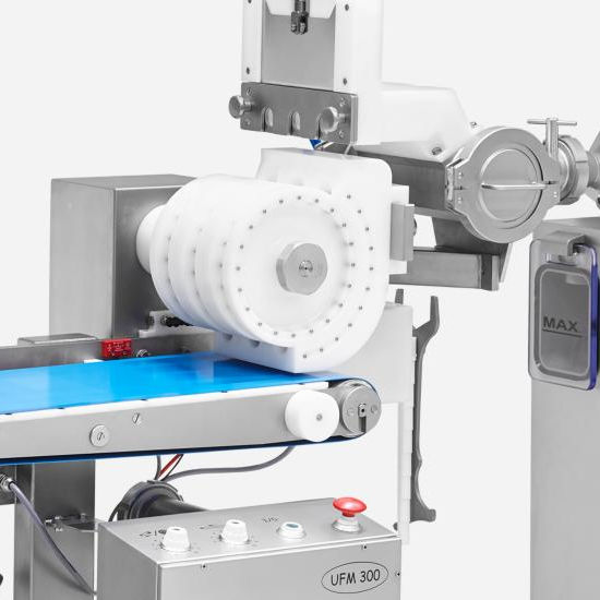 The best way to automate the molding process. The flow divider distributes the portions into rows. The cutter/former mounted directly on the conveyor belt ensures precise portion separation, while the forming roller below it ensures optimal forming.