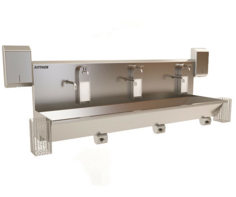 Wash basin with knee valve, wall-mounted extra robust execution. Entirely out of stainless steel, material No. 1.4301. Fully welded body with no crevices to trap dirt. Watertight electronic unit. Water mixing valve for adjusting the temperature. Also available in floor-mounted and sensor-operated executions.
