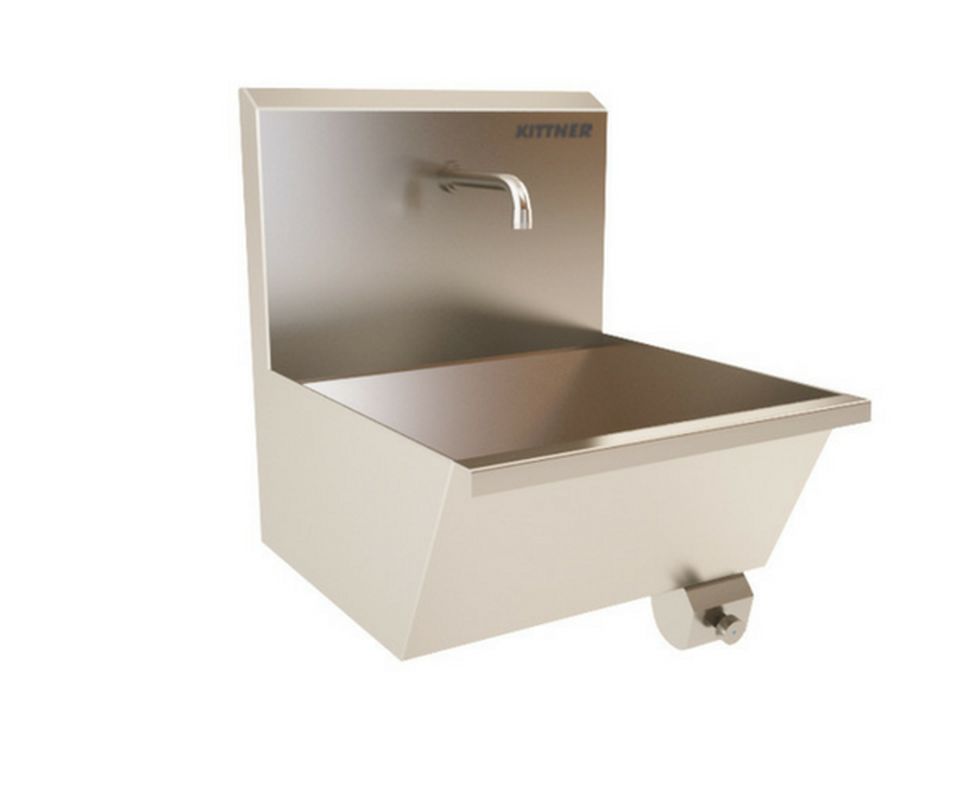 Wash basin with knee valve, wall-mounted extra robust execution. Entirely out of stainless steel, material No. 1.4301. Fully welded body with no crevices to trap dirt. Watertight electronic unit. Water mixing valve for adjusting the temperature. Also available in floor-mounted and sensor-operated executions.
