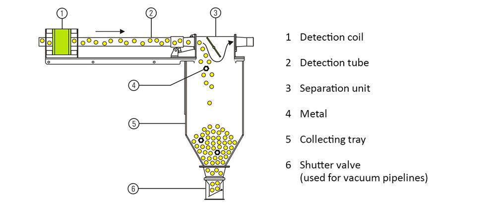 Дрібні металеві частинки в процесі плавлення пластмас часто призводять до дорогих поломок термопластавтоматів, екструдерів і видувних машин. Кількість таких металевих забруднень збільшується під час переробки регрануляту та подрібненої сировини. Як наслідок, засмічення сопел, фільтрів і систем гарячих каналів може призвести до простою виробництва і затримки поставок. Металосепаратор GF використовується у вакуумних і напірних трубопроводах для захисту термопластавтоматів і конвертерів. Він виявляє всі магнітні і немагнітні металеві забруднення (сталь, нержавіюча сталь, алюміній і т.д.) – навіть якщо вони знаходяться всередині продукту. Металеві забруднення викидаються через сепараційний блок «Quick-Flap».