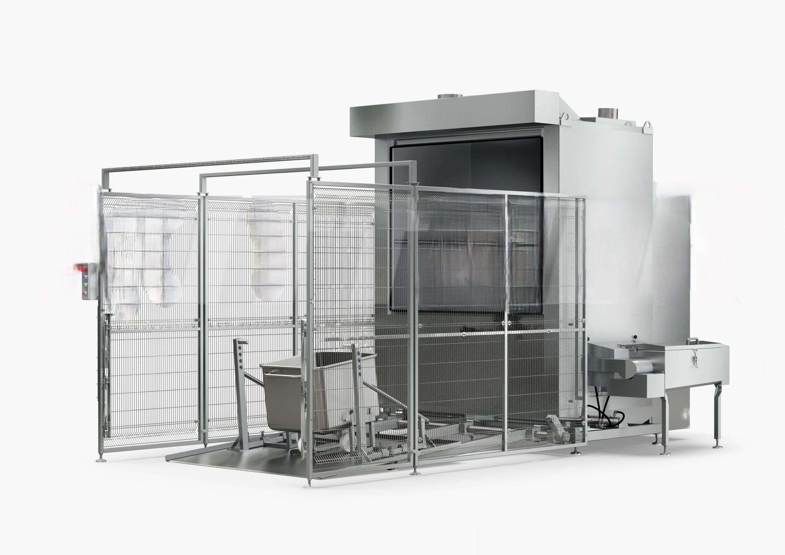 Промислова мийка з електричним підігрівом для візка або контейнера. Управління та дисплей ПЛК Siemens. Ліва електрична шафа. Регульована тривалість циклу відповідно до рівня забруднення. Фільтр з ситовим ящиком затримує грубі забруднення і довше зберігає воду в належних умовах. Дверцята з гідравлічним приводом служать як для завантаження візка, так і для закриття зони миття. Витяжка для відведення пари для монтажу над дверцятами машини. Вільний контакт для дозуючого насоса. Захисна огорожа. Барабанний фільтр. Світлова завіса, категорія захисту 4. Корпус з нержавіючої сталі, матеріал EN 1.4301 / AISI 304. Машина відповідає високим вимогам CE, а також нормам ЄС і USDA.