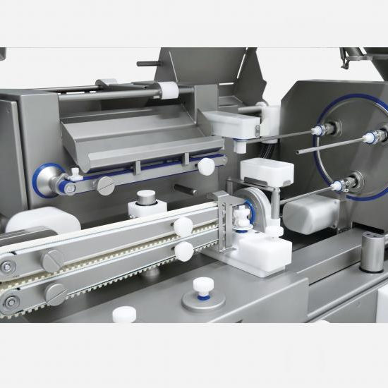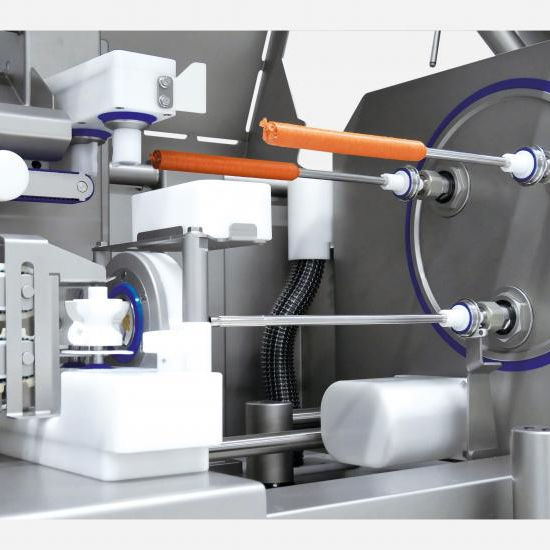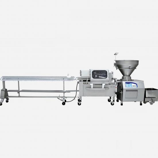 Вакуумний шприц, що безперервно працює, наповнює продукт в оболонку. Система зміщення визначає точну точку з’єднання і в поєднанні з високодинамічним сервоприводом REX забезпечує рівну довжину і максимальну швидкість продуктивності. Продуктивність порцій понад 2500 штук за хвилину для штучних і колагенових оболонок і до 1000 порцій за хвилину для натуральних оболонок – залежно від відповідної довжини продукту.