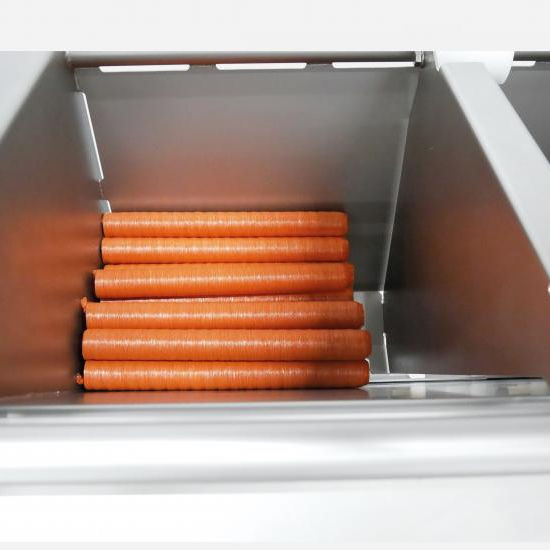 Процес заповнення відбувається за допомогою вакуумного шприца REX. Продукт акуратно подається лопатевим конвеєром, а залишкове повітря максимально видаляється з продукту. Це є основою якості продукції ваших ковбасних виробів.